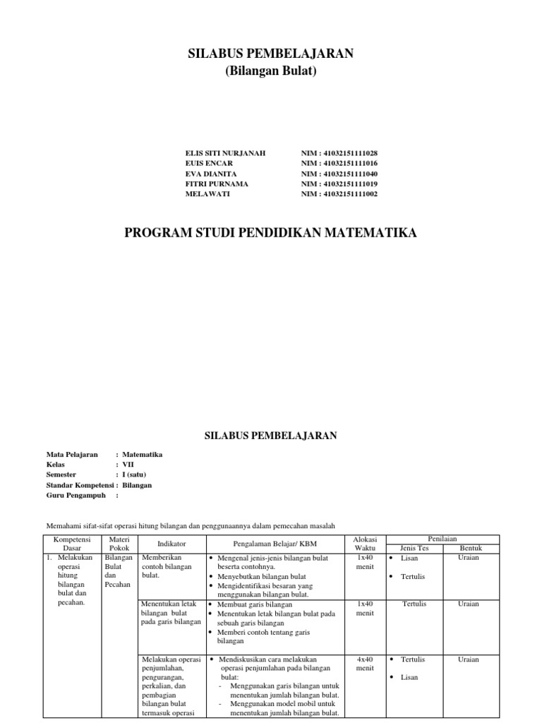 Rpp Matematika Kelas 7 Mts Perkalian Dan Pembagian Bilangan Bulat