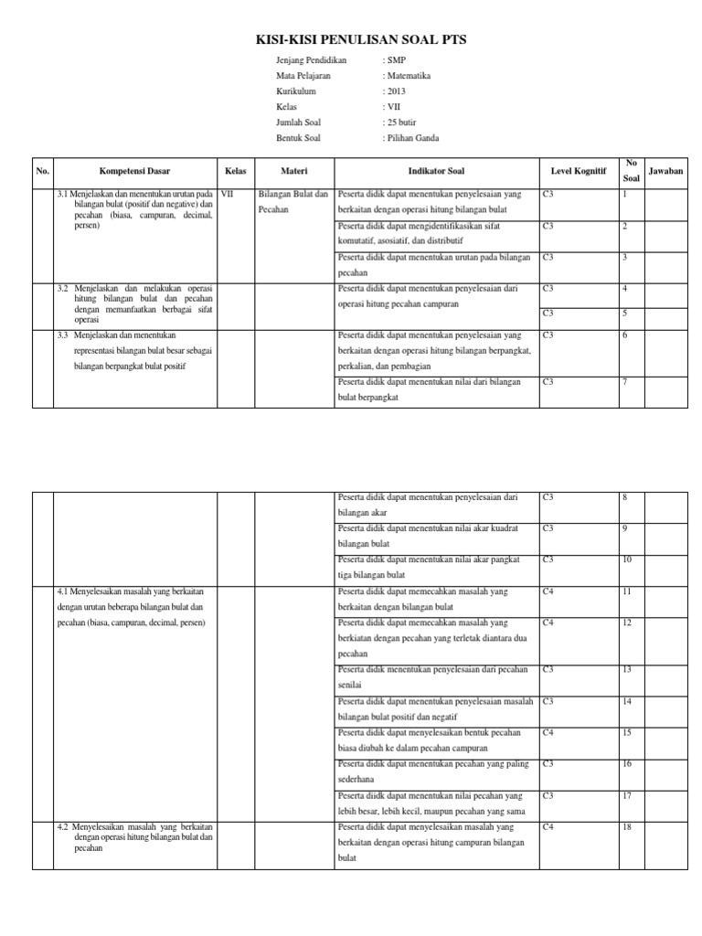 Pdf Kisi Kisi Uts Matematika Kelas 7 Semester 1 Kurtilas Www