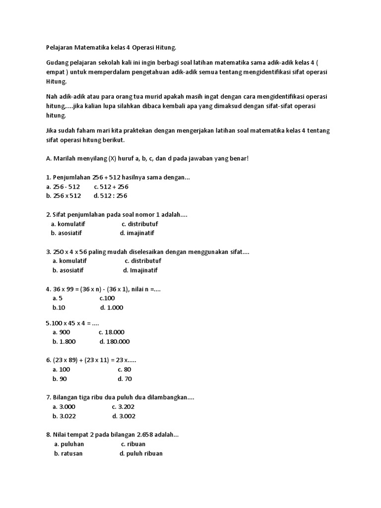 Pelajaran Matematika Kelas 4 Operasi Hitung