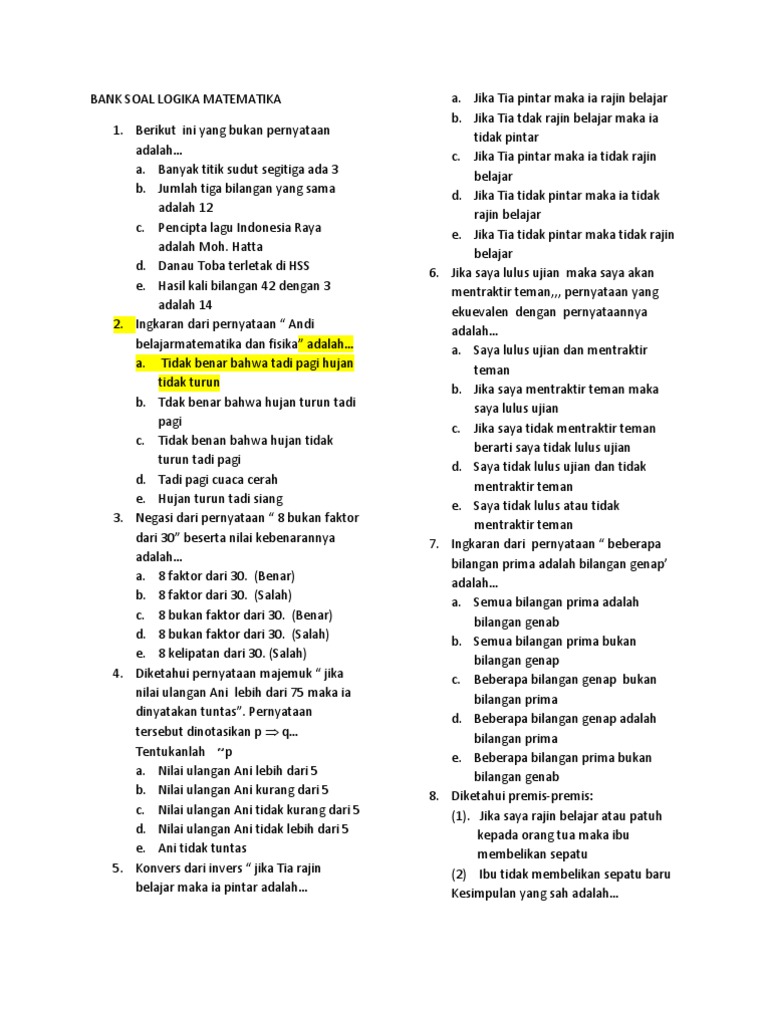 Doc Contoh Soal Latihan Logika Matematika Dan Pembahasan Lengkap