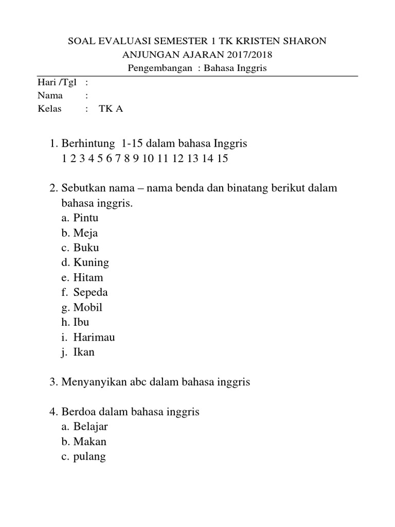 20 contoh soal bahasa inggris untuk tk paud 20 game edukatif untuk anak di android yang mendidik dan gratis. Soal bahasa inggris uts semester 2 kelas xi rpp kelas rangkap semester 1 rpp kelas 3 dan kelas 4 rangkap buku batas pelajaran sd. Karena anak anak tersebut belum menguasai cara menulis dengan baik maka soal bahasa inggris untuk anak tk tidak menggunakan tes tertulis melainkan tes lisan di mana.