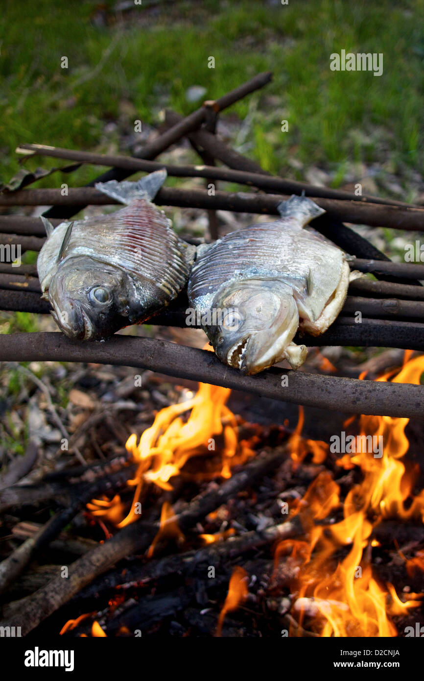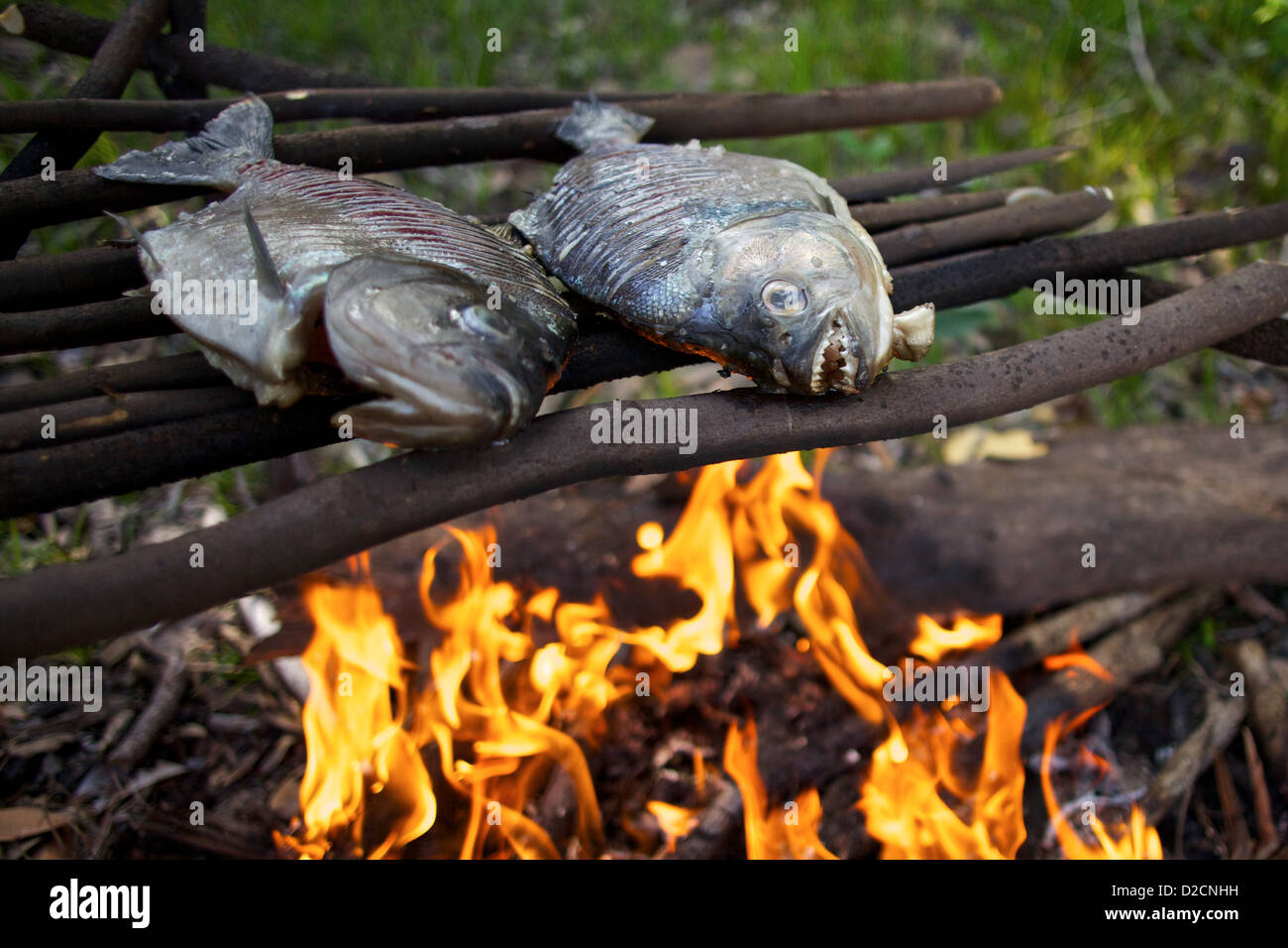Piranha Caught On The Amazon River Grill Over A Fire In