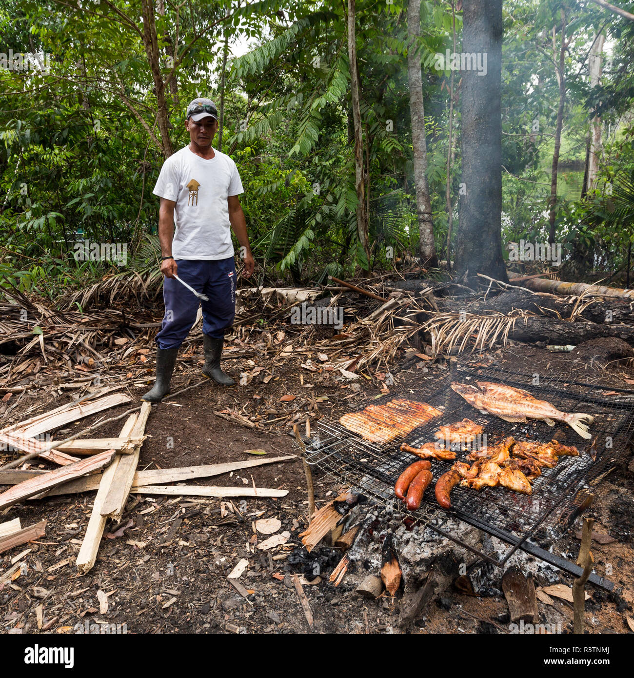 An Amazonian Villager Barbeques Amazon Tambaqui Over A Fire
