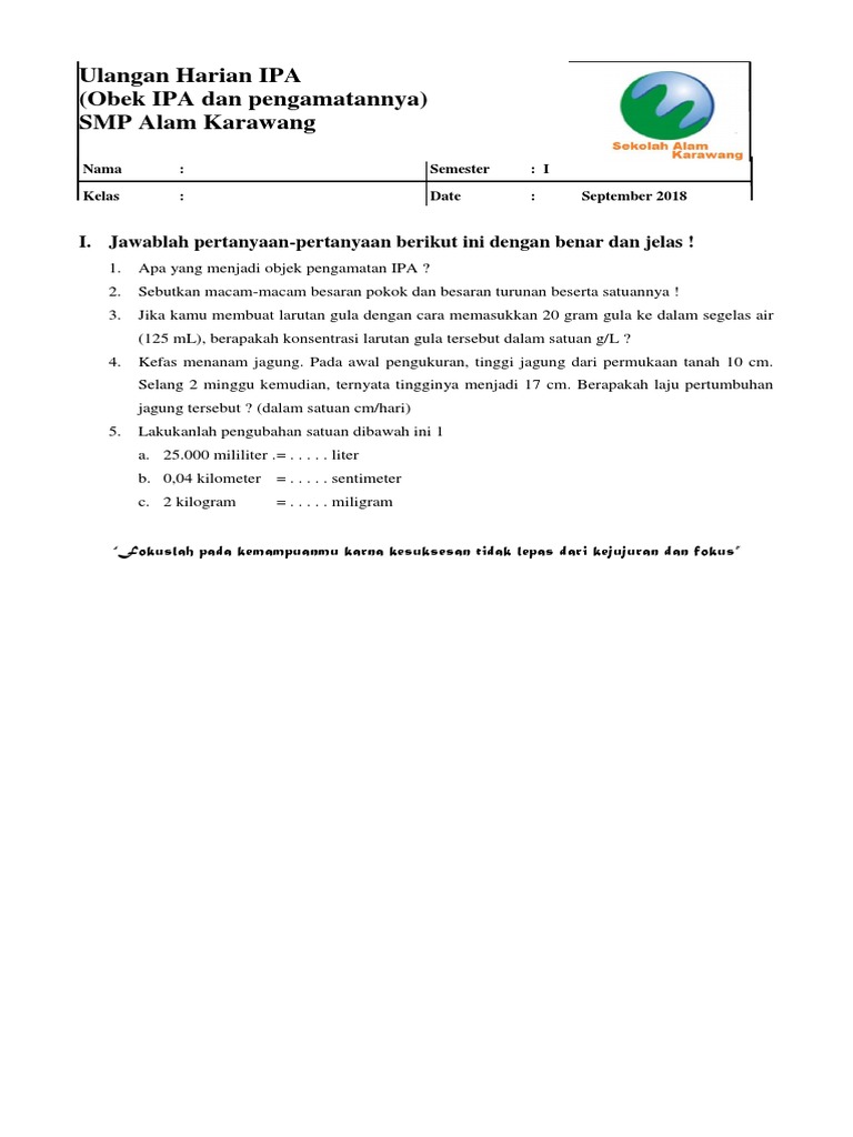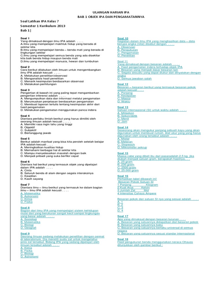 Soal Ulangan Ipa Kelas 7 Objek Ipa Dan Pengamatannya Kurikulum 2013